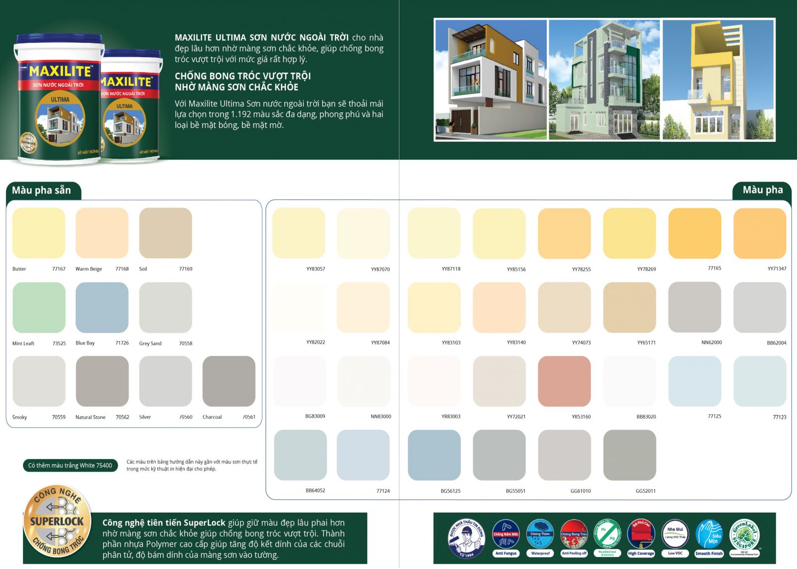 SƠN NƯỚC NGOÀI TRỜI MAXILITE ULTIMA cho nhà đẹp lâu hơn nhờ màng sơn chắc khỏe, giúp chống bong tróc vượt trội với mức giá rất hợp lý. Với Sơn Nước Ngoài Trời Maxilite Ultima bạn sẽ thoải mái lựa chọn trong 1.192 màu sắc đa dạng, phong phú và hai loại bề mặt bóng, bề mặt mờ. Ngoài ra, còn đem đến tính thẩm mỹ cực cao.